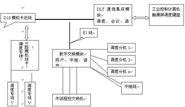 在DLT多路通通信系統(tǒng)平臺(tái)中,由于DLT通信集成模塊具有D10總線,可以和模擬環(huán)路用戶(hù)卡相連,實(shí)現(xiàn)直接用戶(hù)線功能,因而可克服上述兩種調(diào)度設(shè)備的不足,以滿(mǎn)足現(xiàn)代化生產(chǎn)的快速要求、廣域,智能化調(diào)度指揮要求。