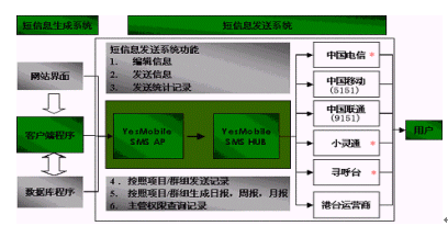 ·由YesMobile提供Api程序包,用戶按照技術(shù)規(guī)范開(kāi)發(fā)Web或客戶端程序完成接入,通過(guò)YesMobile的短信平臺(tái)向用戶指定客戶發(fā)送信息;