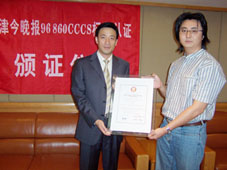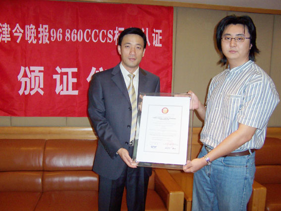 2004年9月9日,天津今晚報公眾服務(wù)中心通過了《全國呼叫中心運(yùn)營績效標(biāo)準(zhǔn)》(CCCS-OP-2003)認(rèn)證,并獲得由中國信息化推進(jìn)聯(lián)盟客戶關(guān)系管理專業(yè)委員會頒發(fā)的認(rèn)證證書(四星級客戶服務(wù)中心),成為國內(nèi)傳媒業(yè)首家通過此認(rèn)證的呼叫中心。