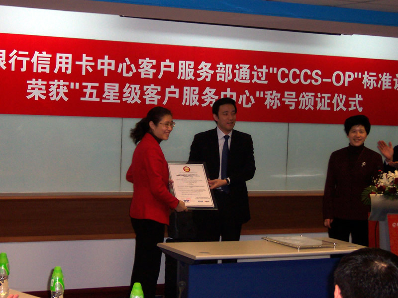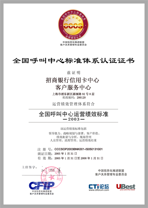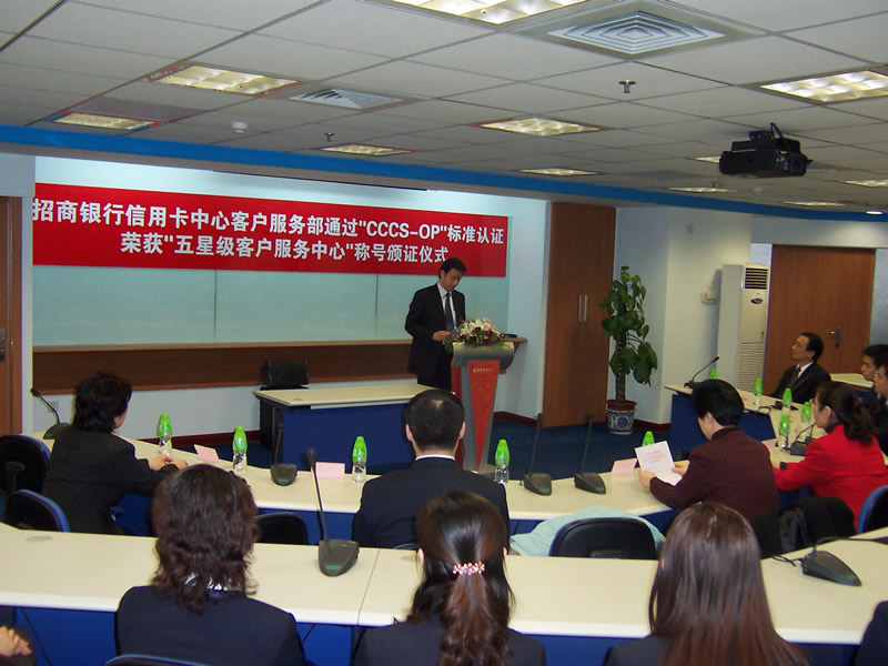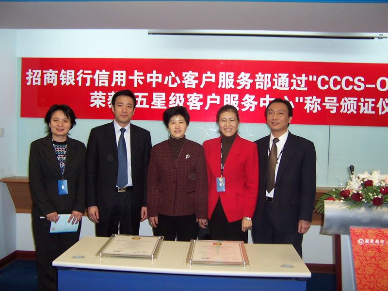 經(jīng)過長達8個月時間的準備和嚴格的認證審核,由中國信息化推進聯(lián)盟客戶關(guān)系管理專業(yè)委員會常務(wù)副主任郭晨東先生親自掛帥組成的項目評審專家小組從領(lǐng)導(dǎo)能力、戰(zhàn)略規(guī)劃與部署、客戶價值、績效衡量與分析、現(xiàn)場管理、人員管理、流程管理、運營績效結(jié)果等八個范疇對招商銀行信用卡中心客戶服務(wù)部進行了全面而嚴格的審核,涉及五大類上百項詳細的運營績效指標,歷經(jīng)初審評估、現(xiàn)場初審、初審評估報告提交與確認、標準試運行、績效全面提升、最終評審等階段,最終審核確認招商銀行信用卡中心客戶服務(wù)完全符合并部分超越《全國呼叫中心運營績效標準》(CCCS-OP-2003)的各項標準指標和要求,于2005年1月31日正式批準招商銀行信用卡中心通過該標準的五星級認證,授予“五星級客戶服務(wù)中心”稱號。