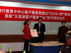這天的上午10點30分,在招商銀行信用卡中心上?偛颗e行了簡約而隆重的頒證儀式,信用卡中心常務(wù)副總經(jīng)理梁瑤蘭從信息產(chǎn)業(yè)部電子信息中心副主任、中國信息化推進聯(lián)盟秘書長劉獻軍手中接過證書,標志著國內(nèi)第一家五星級客戶服務(wù)中心誕生了!