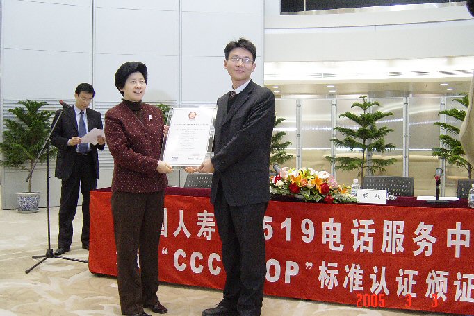 下午2點,在中國人壽保險股份有限公司總部舉行了隆重的頒證儀式。中國人壽保險股份有限公司總部及江蘇、四川、深圳分公司的95519呼叫中心順利通過CCCS標準認證。其中,中國人壽總部及江蘇省分公司95519呼叫中心獲準CCCS五星級認證評定,四川省及深圳市95519呼叫中心獲準CCCS四星級認證評定。