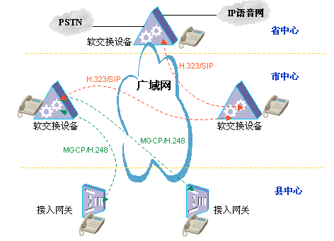 針對這種體系結構,軟交換技術就大有可為了,各地市布置軟交換設備,其間采用H.323/SIP點對點局間協(xié)議,負責各軟交換機之間的通信,在地市到縣區(qū)之間采用MGCP/H.248協(xié)議,這種協(xié)議體系充分吸取了軟交換體系控制與業(yè)務分離的思想,具有高度靈活性,可以兼容PSTN、運營商IP語音網(wǎng)、原有PBX系統(tǒng)等,并且從多方面保障話音質量;管理上由地市軟交換設備對縣區(qū)的接入網(wǎng)關設備進行統(tǒng)一管理,號碼進行統(tǒng)一分配;同時,由地市軟交換設備提供多達數(shù)十種增值業(yè)務,可以實現(xiàn)業(yè)務的統(tǒng)一升級,簡單方便。