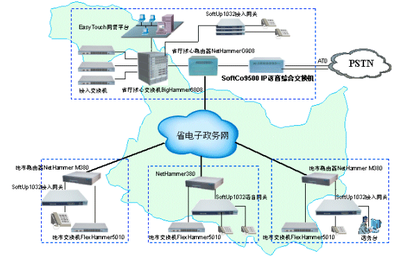 ×省×廳和與各地市局之間原來采用PSTN網(wǎng)絡實現(xiàn)語音通信,省局和市局,市局和市局之間每個月的通訊費用高達數(shù)萬元,無形之中長途電話費用已經成為日常行政支出中很大的一部分。該廳已經采用港灣公司NetHammer
