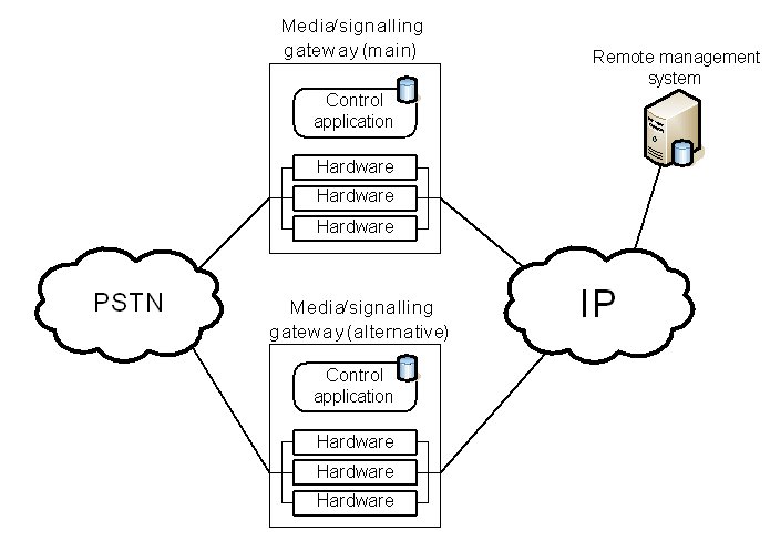 這兩種保護機制的區(qū)別可以從下面的例子進一步闡述。該事例是一種企業(yè)IP-PSTN網(wǎng)關(guān)應(yīng)用。一般情況下,企業(yè)級的網(wǎng)關(guān)并不采用軟交換架構(gòu),所以媒體和信令網(wǎng)關(guān)功能在同一設(shè)備內(nèi)實現(xiàn)。這類網(wǎng)關(guān)是一個獨立的機架,內(nèi)裝能實現(xiàn)媒體和信令處理的硬件板卡和控制類應(yīng)用程序。此設(shè)備可以本地管理,也可以采用遠程管理,如采用標準Web服務(wù)器。