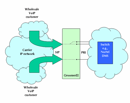 圖1中的GroomerII支持PRI協(xié)議,如:NI-2、ETS300和INS1500等,可以實(shí)現(xiàn)網(wǎng)關(guān)的功能把運(yùn)營(yíng)商自己的電路交換網(wǎng)和IP網(wǎng)絡(luò)相互連接在一起。這種設(shè)置允許網(wǎng)絡(luò)運(yùn)營(yíng)商向其他業(yè)務(wù)供應(yīng)商提供批量VoIP業(yè)務(wù)。這類業(yè)務(wù)運(yùn)營(yíng)商據(jù)此可以向他們的客戶提供具有區(qū)分性的業(yè)務(wù),如:利用SIP電話呼叫等。