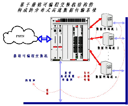 鼎銘高速數(shù)據(jù)傳輸板置于其可編程交換機(jī)內(nèi),外部可以和多臺PC或工控機(jī)相連,因?yàn)榭删幊探粨Q機(jī)可以級聯(lián),所以可以和外部連接的PC或工控機(jī)理論上沒有特別限制。這樣可編程交換機(jī)的內(nèi)部I/O總線(類比于PC機(jī)的PCI或ISA總線)就不再傳輸實(shí)時(shí)數(shù)據(jù)(如語音數(shù)據(jù)),而只負(fù)責(zé)非實(shí)時(shí)性的管理和信令數(shù)據(jù),語音或其它實(shí)時(shí)數(shù)據(jù)從外部PC直接傳入可編程交換機(jī)的高速數(shù)據(jù)傳輸板,然后通過交換直接進(jìn)入外部公共電信網(wǎng)(PSTN)。