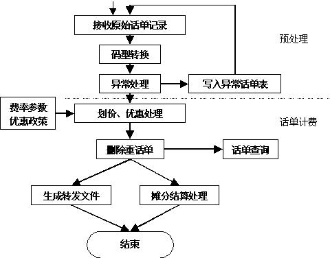 計(jì)費(fèi)劃價(jià)流程圖 在整個(gè)聯(lián)機(jī)計(jì)費(fèi)系統(tǒng)平臺(tái)中,計(jì)費(fèi)處理模塊處于核心的地位,而在計(jì)費(fèi)處理模塊中,最主要的功能就是劃價(jià)、優(yōu)惠,一個(gè)好的計(jì)費(fèi)系統(tǒng)要能適應(yīng)靈活多變的優(yōu)惠政策,為電信服務(wù)商吸引更多的用戶(hù)。 對(duì)于話單計(jì)費(fèi)的功能描述如下: