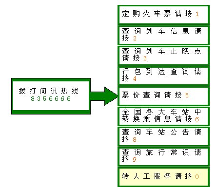 進入系統(tǒng)后可以進行定購火車票、查詢列車信息、查詢列車正晚點、行包到達查詢等操作。所有供查詢信息都由系統(tǒng)實時從數據庫中調用,由訊飛語音合成系統(tǒng)轉換成語音播放,不僅保證了信息的實時性,同時業(yè)務更加靈活,語音效果更好,系統(tǒng)的管理和維護也比以前便捷多了。