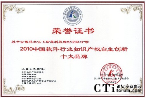 CTI論壇(ctiforum)4月29日消息(記者 潘婷婷):2010年4月25日,由中國知識(shí)產(chǎn)權(quán)研究會(huì)、中國專利保護(hù)協(xié)會(huì)、中國版權(quán)協(xié)會(huì)等單位聯(lián)合舉辦的“2010中外企業(yè)知識(shí)產(chǎn)權(quán)大會(huì)”在人民大會(huì)堂隆重舉行。在當(dāng)日的“2010中國知識(shí)產(chǎn)權(quán)盛典頒獎(jiǎng)典禮”中,科大訊飛憑借強(qiáng)大的自主創(chuàng)新能力以及在知識(shí)產(chǎn)權(quán)創(chuàng)造、保護(hù)與應(yīng)用方面的突出表現(xiàn)獲評(píng)“2010年中國軟件行業(yè)知識(shí)產(chǎn)權(quán)自主創(chuàng)新十大品牌”。