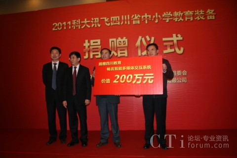 CTI論壇(ctiforum)11月11日消息(記者 潘婷婷): 2011年11月10日,科大訊飛在成都嬌子國際會議中心舉行了隆重的捐贈儀式,向四川省各市、地州中小學(xué)捐贈了價值200萬元的暢言系列教學(xué)產(chǎn)品。會議由四川省教育廳技術(shù)物資裝備處處長張生主持,四川省教育廳副廳長張林祥、科大訊飛副總裁徐玉林在儀式上致辭,來自各市、地州教育主管部門領(lǐng)導(dǎo)、各縣區(qū)教育局負責(zé)人、受贈學(xué)校教師代表,以及相關(guān)媒體共100多人等參加了捐贈儀式。
