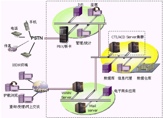 將PSTN訪(fǎng)問(wèn)、Internet訪(fǎng)問(wèn)有機(jī)結(jié)合,對(duì)傳統(tǒng)呼叫中心進(jìn)行擴(kuò)充,支持多種接入方式,多種交流渠道,具有傳統(tǒng)呼叫中心無(wú)法比擬的優(yōu)越性。