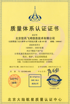 經過近半年時間的建立和保持質量體系運行,佳訊飛鴻于在2002年3月順利的通過為期三天的嚴格審核,并重點對佳訊公司核心技術的CTI平臺進行審核。2002年4月2日通過了ISO國際組織的新體系標準ISO9001:2000的體系認證,取得了通過該標準的認證證書。佳訊飛鴻公司也成為國內第一家對CTI平臺進行審核并通過認證的公司。其完成標志著公司從成立之時起即嚴格遵循國際企業(yè)標準及現(xiàn)代企業(yè)管理模式,以軟件產品質量管理體系為載體,以客戶需求為導向。全面提高產品、服務質量,順應不斷變化的技術發(fā)展方向和市場變化,在質量、技術、成本和交期等方面全力滿足客戶需求,為客戶提供最佳性價比的產品和服務。