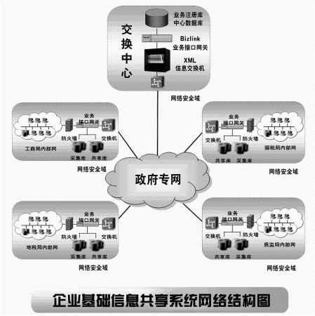 (1) 通過企業(yè)基礎(chǔ)信息交換與共享系統(tǒng)將不同的政府部門辦公網(wǎng)絡連接在一起,形成資源共享,消除孤島現(xiàn)象;
