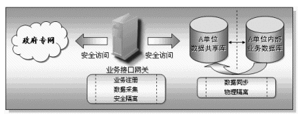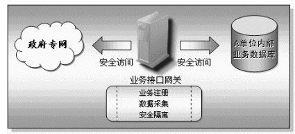 業(yè)務接入網(wǎng)關(guān)放置在每一個接入到本系統(tǒng)的部門或單位內(nèi),具有快速方便的異構(gòu)數(shù)據(jù)庫的連接能力,它主要完成兩個方面的功能,一方面實現(xiàn)本部門共享信息的對外發(fā)布,另一方面也通過核心的信息交換機實現(xiàn)其它相關(guān)部門的共享信息的采集工作。業(yè)務接口網(wǎng)關(guān)具有兩個網(wǎng)絡接口,一端連接本單位的內(nèi)部網(wǎng)絡,另一端接入政府專網(wǎng)中。