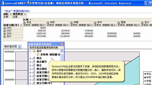 可以利用SynleadCRM企業(yè)版提供的在線聯(lián)機分析工具實現(xiàn),也可以導出到EXCEL中,利用EXCEL的有關(guān)功能實現(xiàn)。OLAP在線聯(lián)機分析,屬于商業(yè)智能BI的組成部分之一,它允許您對數(shù)據(jù)進行任意的上鉆、下鉆,旋轉(zhuǎn)、切片、切塊,得到更豐富的、更有價值的圖表和報表。