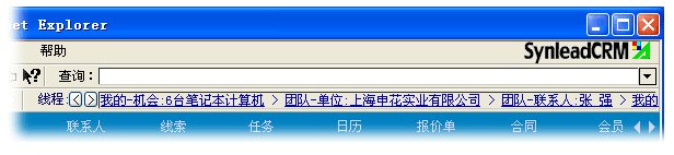 值得欣喜的是,部分CRM廠商意識到用戶迷路問題的嚴(yán)重性,并清楚IE瀏覽器具備的頁面歷史尋址(History Location)功能滿足不了頁面內(nèi)數(shù)據(jù)庫復(fù)雜、動(dòng)態(tài)歷史條件的記憶,必須另外打造屬于CRM應(yīng)用程序自身的歷史堆棧。少許CRM軟件開始提供歷史“后退”、“前進(jìn)”按鈕,SynleadCRM歷史精確度保持領(lǐng)先地位。