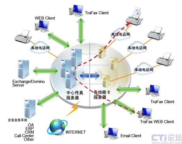 Server板卡服務(wù)器都將通過(guò)Internet或企業(yè)網(wǎng)絡(luò)而相互連接起來(lái),協(xié)同工作, 共同分擔(dān)工作負(fù)荷, 共享資源和傳真信道。這樣傳真也是被傳遞到離目的地最近的板卡服務(wù)器后才發(fā)送出去,從而將國(guó)際,國(guó)內(nèi)傳真費(fèi)用減少為本地傳真費(fèi)用。