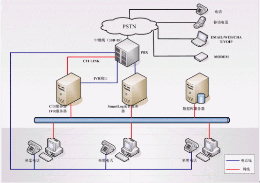 呼叫中心前端通信平臺,主要由SIEMENS HiPath系列交換機(jī),計(jì)算機(jī)電話集成服務(wù)器(UltraCTI),交互式語音應(yīng)答服務(wù)器(ctsIVR),在線錄音監(jiān)聽服務(wù)器(SmartLog),數(shù)據(jù)庫服務(wù)器,MCI服務(wù)器以及傳真服務(wù)器幾個(gè)部分組成。中繼線多采用30B+D或2B+D接入。