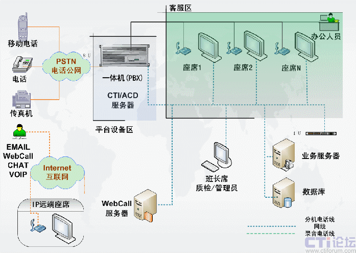 包含CTI服務(wù)器、IVR/FAX服務(wù)器、錄音監(jiān)控 系統(tǒng)、報表統(tǒng)計系統(tǒng),CRM客戶管理等。