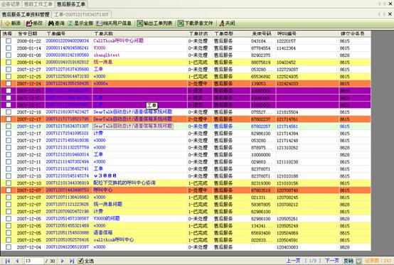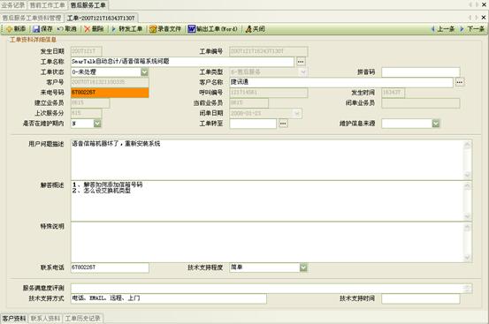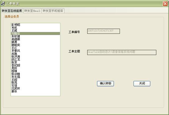 3) 工作流閉環(huán)、客戶通話歷史,客戶聯(lián)系歷史,工單流轉:工作流系統(tǒng)是通過工單實現(xiàn)各工作流環(huán)節(jié)的聯(lián)系以及工作流的定義管理,工作流狀態(tài)查詢、更改的。操作員可根據(jù)用戶的不同業(yè)務請求,建立相應的工單記錄,并對該事后處理過程進行跟蹤;也可對要處理的事務形成工單轉給相應的操作員,并跟蹤該工單的處理過程;可定期提示操作員處理要過期的工單,以提高服務質量;每次處理過程都會有詳細的記錄,以便統(tǒng)計查詢 。如圖8、9、10: