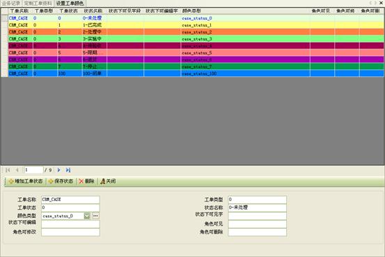 2)自定義工單:根據(jù)所定義的不同類型工單,用戶還可以靈活定制每種工單的具體內容,并且還可以設置顯示的顏色,可以更明顯的區(qū)分不同狀態(tài)的工單、顯示顏色等。如圖6和7所示: