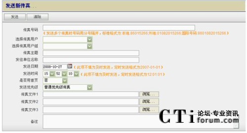B、客戶端發(fā)送傳真:在客戶端選擇發(fā)送傳真文件,可以將文件定時(shí)發(fā)送至某一用戶或發(fā)送至用戶組(用于批量發(fā)送傳真);