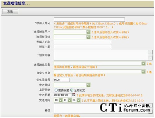 - 群發(fā)短信:通過個(gè)人的Web方式的客戶端給系統(tǒng)預(yù)先設(shè)置好的用戶組或?qū)懭攵鄠(gè)對方手機(jī)號(hào)碼發(fā)送短信;
