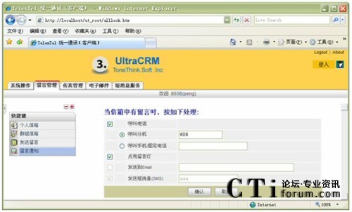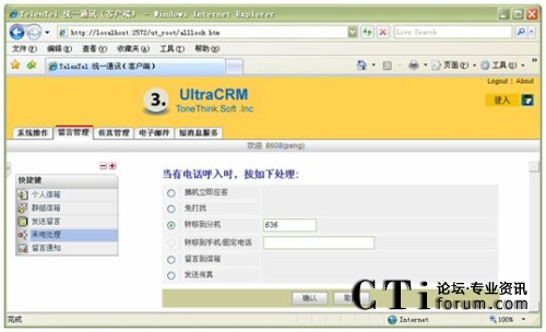 信箱主人通過Web方式的客戶端,根據(jù)實(shí)際需要,將來話設(shè)置為轉(zhuǎn)接到不同的目標(biāo),如:語音信箱留言、內(nèi)部其它分機(jī)、轉(zhuǎn)移至手機(jī)、轉(zhuǎn)移至外線;