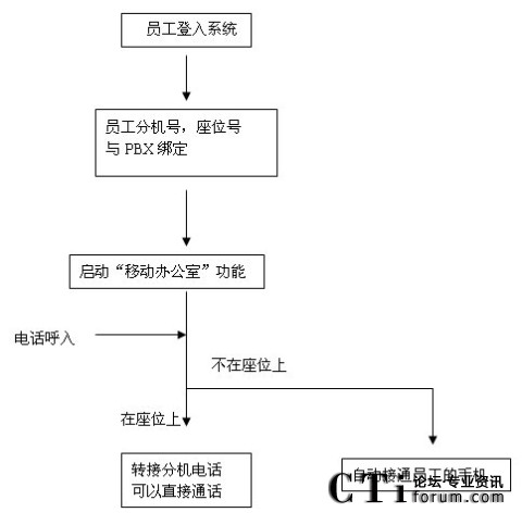 每個(gè)需要到企業(yè)辦公的員工,可以通過門禁系統(tǒng),或?qū)iT一臺(tái)PC上進(jìn)行登入,通過后由系統(tǒng)自動(dòng)分配或員工選擇一個(gè)空閑的座位,座位號(hào)與員工的分機(jī)號(hào)碼綁定,所有對這個(gè)員工分機(jī)的呼叫均被自動(dòng)轉(zhuǎn)移到其座位上的辦公電話上;