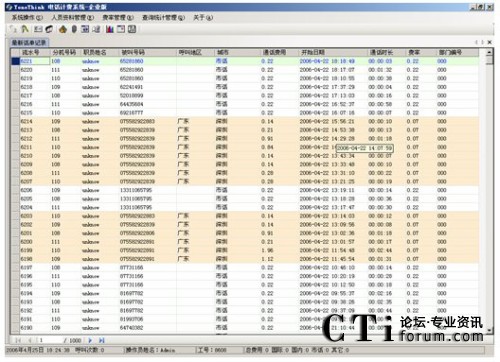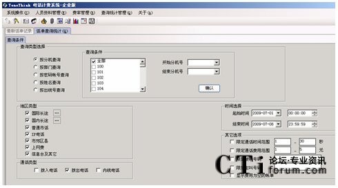 系統(tǒng)提供多種查詢條件,進(jìn)行話單明細(xì)和話單結(jié)算的統(tǒng)計(jì),如:按分機(jī)、部門、密碼、職員名稱、出現(xiàn)號(hào)碼、通話時(shí)間范圍、通話費(fèi)用范圍、制定主叫、制定被叫、不同的通話類型(國內(nèi)長途、國際長途、市話、IP等)。