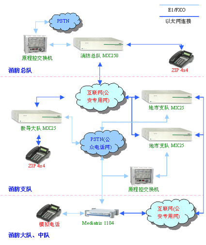 整個系統(tǒng)主要由Zultys MX250交換機、ZIP 4x4話機、ZIP 4x5話機構成。MX250交換機擁有傳統(tǒng)電話交換機(PBX/PABX)的全部功能,可以真正把消防通信的數(shù)據(jù)網(wǎng)絡和電話網(wǎng)絡融為一體,實現(xiàn)基于IP的語音通訊。