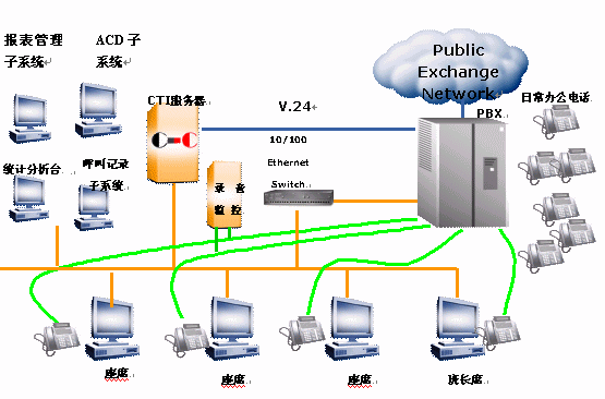 系統(tǒng)采用PBX提供完備的呼叫控制功能,能夠滿足呼叫中心電話應(yīng)用的需要,實(shí)現(xiàn)呼入、呼出等各種電話控制功能;還需要提供自動(dòng)呼叫分配ACD系統(tǒng),呼叫管理系統(tǒng),用于有效管理所有話務(wù);同時(shí),PBX具有CTILink接口,可實(shí)現(xiàn)與計(jì)算機(jī)系統(tǒng)的連接。