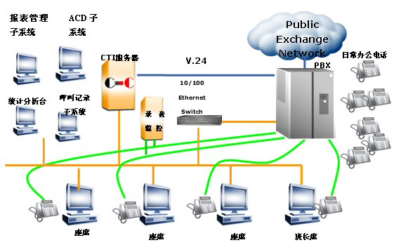 系統(tǒng)采用Siemens Hipath 3750交換機(jī),通過該型號交換機(jī)所具有的CTILink接口,向用戶提供了完整的呼叫控制功能,能夠滿足呼叫中心所應(yīng)有的電話控制的需求;同時提供ACD(自動呼叫分配)功能,實現(xiàn)有效的分配話務(wù)。