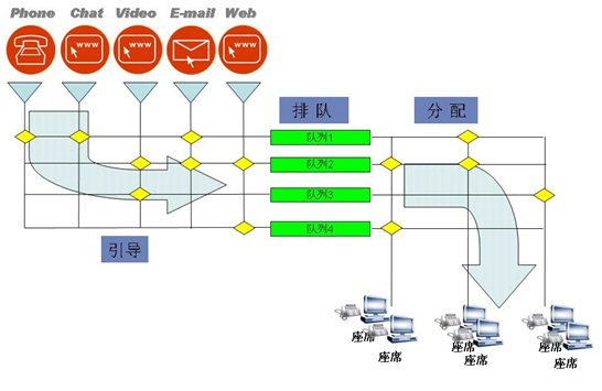 對(duì)于多種媒體采用統(tǒng)一的ACD處理方式,經(jīng)過引導(dǎo),進(jìn)入不同的隊(duì)列,分配到不同的坐席組。