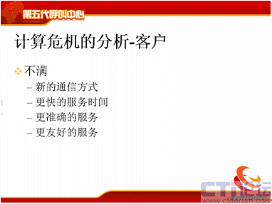 現(xiàn)在我們就分析一下后果,這時候計算危機(jī)的分析對于客戶來說,新的通訊方式我們都需要,可是呼叫中心沒有公布,我無法使用,更快的服務(wù)時間,大家看到了,比如說Web Chat,目前我點(diǎn)擊了80%是直接進(jìn)入留言的頁面,也就是說這時候沒有人工來服務(wù)了,或者是等待時間非常非常長,一個小時以后告訴我,排隊已經(jīng)到了,已經(jīng)沒有人能為我服務(wù)的,服務(wù)時間是根本沒有辦法保證的。第三個方面我們要更準(zhǔn)確的服務(wù),電話打進(jìn)去以后告訴我的信息和網(wǎng)絡(luò)告訴我的信息是完全不一樣的呢?為什么呢?因?yàn)樗闹R庫沒有關(guān)聯(lián)起來,業(yè)務(wù)流程沒有關(guān)聯(lián)起來,這種更友好的服務(wù),考核的指標(biāo)都是一樣的。