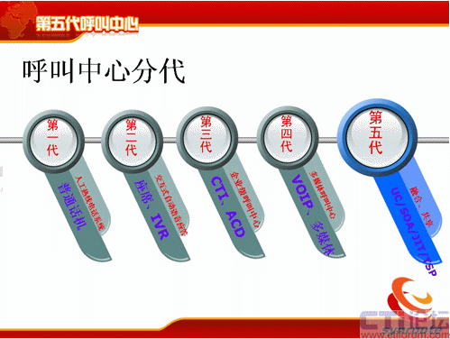 從分代上來講,和何總說的稍微有點(diǎn)差異,但是基本上一樣的,第一代是人工熱線的電話系統(tǒng),時間點(diǎn)也差不多;第二代是有了座席IVR、自動語音應(yīng)答這個特點(diǎn);第三代是有了CTI、ACD企業(yè)級的呼叫中心;第四代是互聯(lián)網(wǎng),有VOIP、多媒體等等這些多媒體的呼叫中心。那么第五代是什么?第五代的典型特征是融合共享,它是有四個特性,UC、SOA、JIT和TSP,這是五代的幾個主要特點(diǎn)。