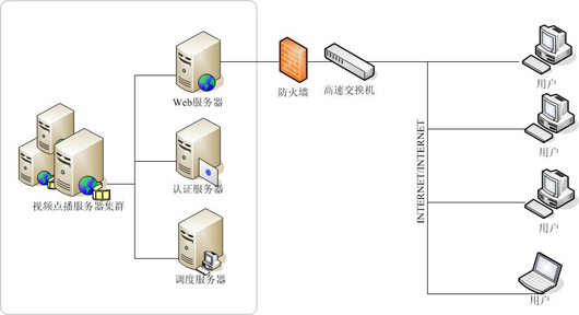 客戶可以通過訪問放置在甘肅省移動(dòng)公司面機(jī)房內(nèi)的Web服務(wù)器,同時(shí)WEB服務(wù)器發(fā)送請求到認(rèn)證服務(wù)器,通過客戶AAA級(jí)認(rèn)證后的,客戶經(jīng)過調(diào)度服務(wù)器將請求反饋給視頻服務(wù)器,完成視頻點(diǎn)播流程,具體架構(gòu)如圖。