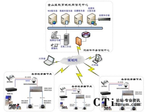 流媒體平臺(tái)采用分布式架構(gòu)部署,分為web服務(wù)器,數(shù)據(jù)庫服務(wù)器、直播服務(wù)器和流服務(wù)器,如有必要可在信息中心架設(shè)采集工作站搭建網(wǎng)絡(luò)電視或?qū)崨r直播應(yīng)用,在各個(gè)學(xué)校已經(jīng)部署錄播系統(tǒng)或直播系統(tǒng)的教室配置流媒體功能組件,這樣錄播實(shí)況可以實(shí)時(shí)傳送到流媒體平臺(tái)管理中心的全局直播服務(wù)器上,同時(shí)錄播的學(xué)校本色課件也可以上傳存儲(chǔ)到金山區(qū)教育局信息中心的流存儲(chǔ)服務(wù)器上,方便今后的檢索、點(diǎn)播、評估等各種應(yīng)用。