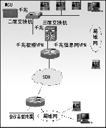 視頻VPN的千兆出口、信息網(wǎng)VPN的千兆出口以及MCU的千兆口(通過MCU側(cè)的二層交換機(jī))分別連接到省公司的骨干三層交換機(jī)上。通過三層交換機(jī)的路由設(shè)置,MCU既可以與視頻VPN互相訪問,也可以與信息網(wǎng)互相訪問,但視頻VPN和信息網(wǎng)不能互相訪問。