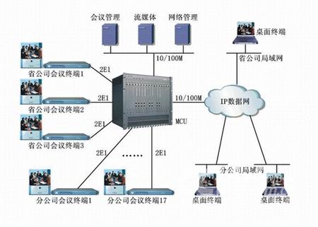 該系統(tǒng)基于蘇州科達(dá)公司KDV系列視頻會議產(chǎn)品,全網(wǎng)采用1套MCU、20套會議室型終端和200多套桌面型終端,其中會議室型終端通過2條E1線路捆綁與MCU相連、桌面型終端通過10/100M以太網(wǎng)和IP數(shù)據(jù)網(wǎng)與MCU相連?傮w網(wǎng)絡(luò)結(jié)構(gòu)如下圖所示:
