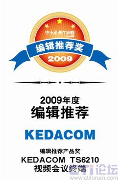 CTI論壇(ctiforum)05月20日消息: 近日,由《中小企業(yè)IT采購》舉辦的2009年度編輯推薦獎評測活動落下帷幕,科達TS6210視頻會議終端以其卓越的視音頻質(zhì)量、優(yōu)異的網(wǎng)絡適應性、極高的性價比在本次評選活動中脫穎而出,獲此殊榮。