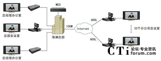 2009年6月,領(lǐng)先的視訊廠商科達(dá)攜TrueSens(致勝)視頻會議系統(tǒng)走進(jìn)海瀾,為海瀾集團(tuán)搭建了一套覆蓋總部2個領(lǐng)導(dǎo)辦公室、1個銷售會議室及全國32個分公司的視頻會議系統(tǒng)。整個方案在部署上非常便捷,海瀾江陰總部的機(jī)房架設(shè)一臺高、標(biāo)清一體化多點(diǎn)控制單元(MCU),銷售會議室、集團(tuán)王總、陶總的辦公室以及海瀾集團(tuán)在全國的32個分公司銷售會議室則各部署一套視頻會議終端?偛繋挒100M,分支機(jī)構(gòu)則均通過普通ADSL接入。系統(tǒng)拓?fù)鋱D如下: