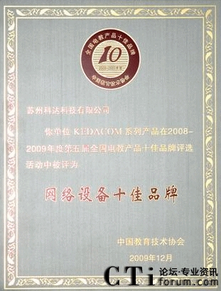 CTI論壇(ctiforum)12月14日消息(記者 張塵):2009年12月4日,由國內教育權威機構“中國教育技術協(xié)會”主辦,以讀者調查問卷的形式舉行的第五屆全國電教產品十佳品牌頒獎典禮在福州梅峰賓館盛大開幕,科達教育視頻會議產品憑借卓越的產品性能和良好的客戶服務入選網絡產品類十佳之列,同時也成為首個入選十佳品牌的視頻會議產品。