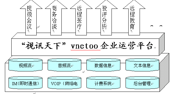 VNETOO視訊運(yùn)營(yíng)平臺(tái)具有強(qiáng)大的數(shù)據(jù)功能和優(yōu)質(zhì)的音視頻效果,是集"視頻+語(yǔ)音+數(shù)據(jù)+IM(即時(shí)通信)+VOIP(網(wǎng)絡(luò)電話(huà))+計(jì)費(fèi)+后臺(tái)管理"的基于IP網(wǎng)絡(luò)世界一流視訊服務(wù)提供平臺(tái),它革命性地開(kāi)創(chuàng)了視訊運(yùn)營(yíng)領(lǐng)域的全新模式。(見(jiàn)圖表一:"視訊天下"vnetoo運(yùn)營(yíng)平臺(tái)結(jié)構(gòu))。