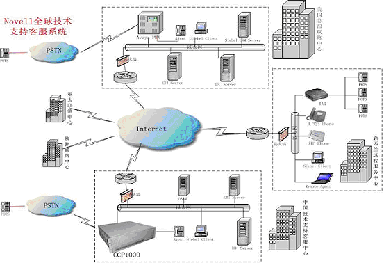 Novell中國(guó)技術(shù)支持中心采用融天科技的RT-CCP1000作為呼叫處理平臺(tái),業(yè)務(wù)處理通過Internet用瀏覽器的方式使用美國(guó)現(xiàn)有的Siebel CRM業(yè)務(wù)系統(tǒng),作為Novell全球客戶服務(wù)支撐體系的一個(gè)分支,響應(yīng)來自全球的客戶服務(wù);贗P網(wǎng)絡(luò),系統(tǒng)設(shè)立了遠(yuǎn)端座席,為不同地區(qū)的用戶提供本地化、無(wú)差異化的服務(wù)。