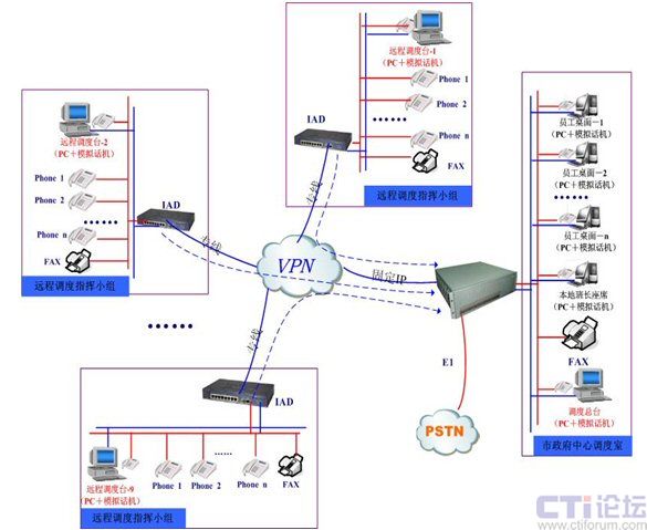本次項(xiàng)目中,融天科技為大連市政府部署的防火調(diào)度指揮系統(tǒng)涉及點(diǎn)包括市政府中心調(diào)度室和分布在大連市各轄區(qū)的9個(gè)遠(yuǎn)程指揮小組,中心調(diào)度室通過RT-CCP1000一體化調(diào)度平臺部署10個(gè)中心調(diào)度值班員,轄區(qū)的9個(gè)遠(yuǎn)程指揮小組通過大容量IAD設(shè)備和政府VPN專網(wǎng)遠(yuǎn)程注冊到中心調(diào)度室RT-CCP1000平臺上,同時(shí)RT-CCP1000平臺與本地的PSTN通過一條數(shù)字中繼E1連接,作為系統(tǒng)的出入口。如下圖所示: