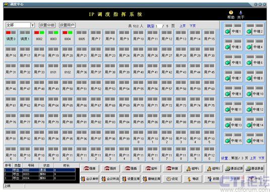 在此界面中實(shí)現(xiàn)了配置管理功能和呼叫相關(guān)功能。配置管理分為:設(shè)置、修改和刪除分組,設(shè)置用戶,設(shè)置中繼,翻頁等功能;呼叫相關(guān)功能:強(qiáng)接、強(qiáng)拆、強(qiáng)插、監(jiān)聽、轉(zhuǎn)接、組呼、設(shè)定等級、設(shè)定權(quán)限、設(shè)定夜服、會議相關(guān)等功能。另外,可以在本軟調(diào)度系統(tǒng)中檢索瀏覽相關(guān)通話記錄,并可對錄音進(jìn)行回放。