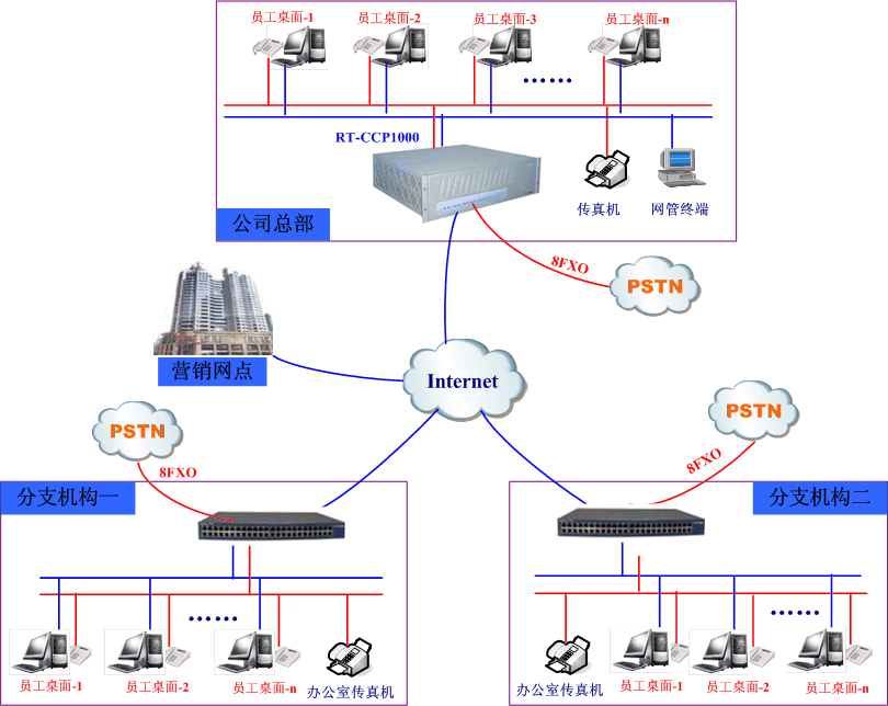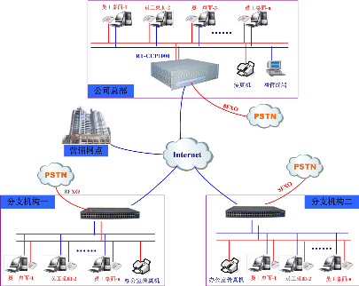 生產(chǎn)總部與分支機構(gòu)、營銷網(wǎng)點實現(xiàn)統(tǒng)一辦公電話功能(即VOIP組網(wǎng)+辦公電話功能)。
