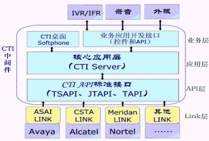 隨著交換機(jī)智能化的發(fā)展,交換機(jī)開放了CTI Link,用于計算機(jī)連線到交換機(jī),實現(xiàn)CTI控制與應(yīng)用,但是這種CTI Link的接口實際上并沒有一個統(tǒng)一的標(biāo)準(zhǔn),基本都是各廠商自己的標(biāo)準(zhǔn),甚至目前稱之為標(biāo)準(zhǔn)的CSTA 協(xié)議也是在交換機(jī)廠商推出自己的CTI Link接口協(xié)議后才制定的;同樣的CTI業(yè)務(wù)應(yīng)用是否能夠構(gòu)建在不同CTI Link標(biāo)準(zhǔn)的硬件交換機(jī),這是CTI中間件提出來的初衷。